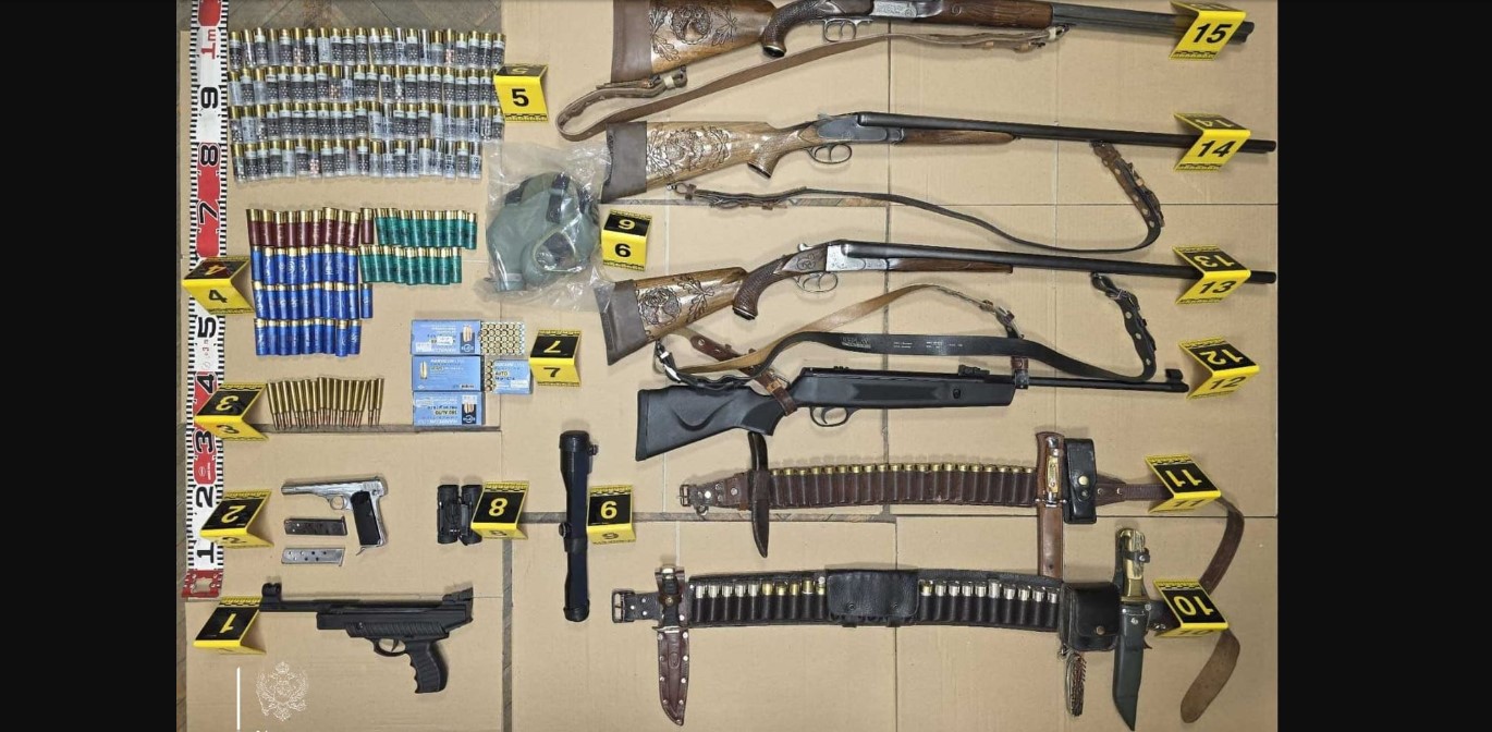 "Gdje je pronađen i oduzet veći arsenal oružja i opreme. Zaplijenjene su dvije lovačke puške nepoznate marke i kalibra, puška marke „Remo“, vazdušna puška „Hatsan“, pištolj „FN Browning“, gasni pištolj, kao i 380 komada municije različitih vrsta i kalibra. Takođe su pronađeni i dva rezervna okvira za pištolj, optički nišan i gas maska.